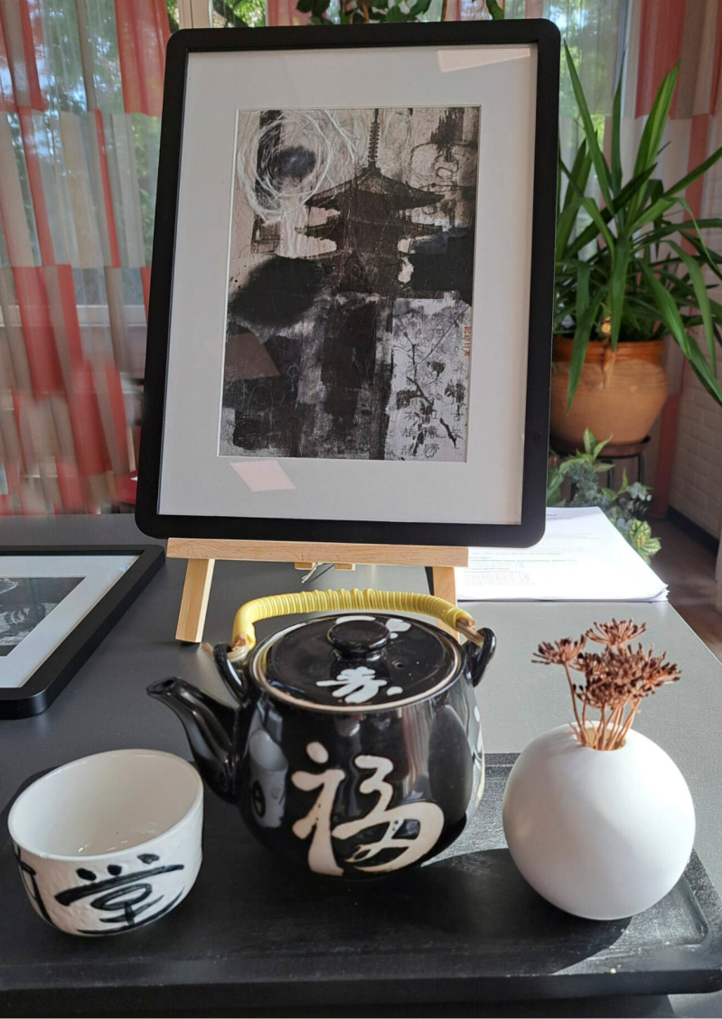 Mijn kunstwerken zijn een unieke combi van foto’s die ik maak tijdens mijn reizen door Azië en Afrika, elementen uit de natuur, Japans papier zoals Kozo en Washi, eigen ontworpen patronen, aquarelverf en hergebruikte materialen.